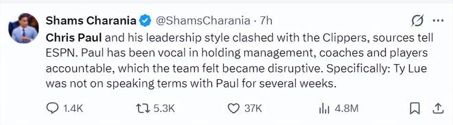 北京时间12月4日,ESPN记者Shams报道了快船将保罗遣送回家的细节,保罗的领导风格与快船发生了冲突。他直言不讳的批判管理层、教练组、球员,这让球队内部发生混乱,泰伦卢已经几周没有跟保罗进行过有效沟通。